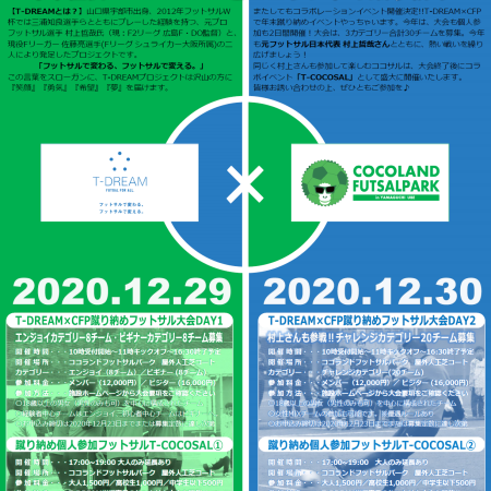 2020/12/16T-DREAM & ココランドフットサルパーク宇部 2020年末蹴り納めイベント 12月29日・30日 申込受付中!!