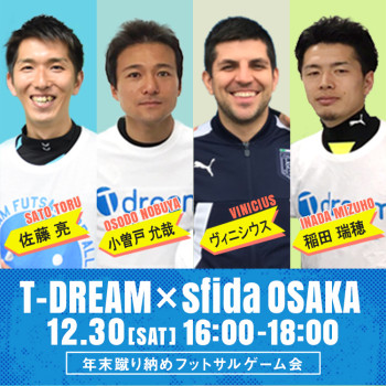 2017/12/27※定員数変更のお知らせ 12月30日(土) T-DREAM × sfida sports park osaka 年末蹴り納めゲーム会 開催